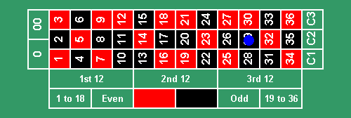 A Dozen bet is very similar to the column bet except that instead of covering a column of numbers on the table, it covers either the 1st, 2nd, or 3rd consecutive group of 12 numbers. That is the 1st 12 would cover 1-12, the 2nd 12 would cover 13-24, and the last 12 would cover 25-36. Again, 0 and 00 aren't covered and are automatic losers. Here is an
